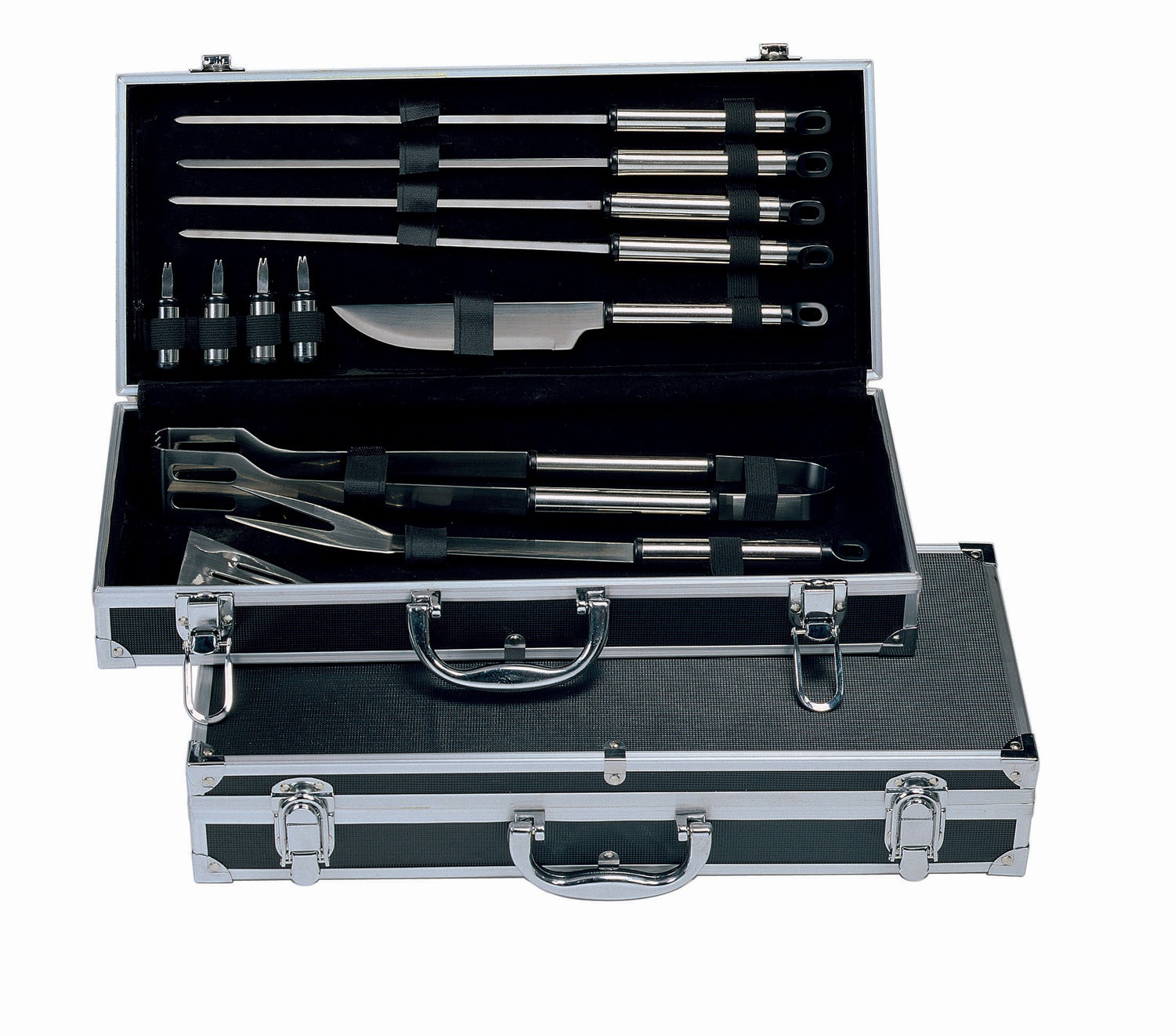 Beautifully presented 12 piece BBQ set with stainless steel tools. The contents inlcude a spatula, fork, 4 long skewers, a knife, tongs and 4 corn cob holders packed in a hard black carry case with silver trim.