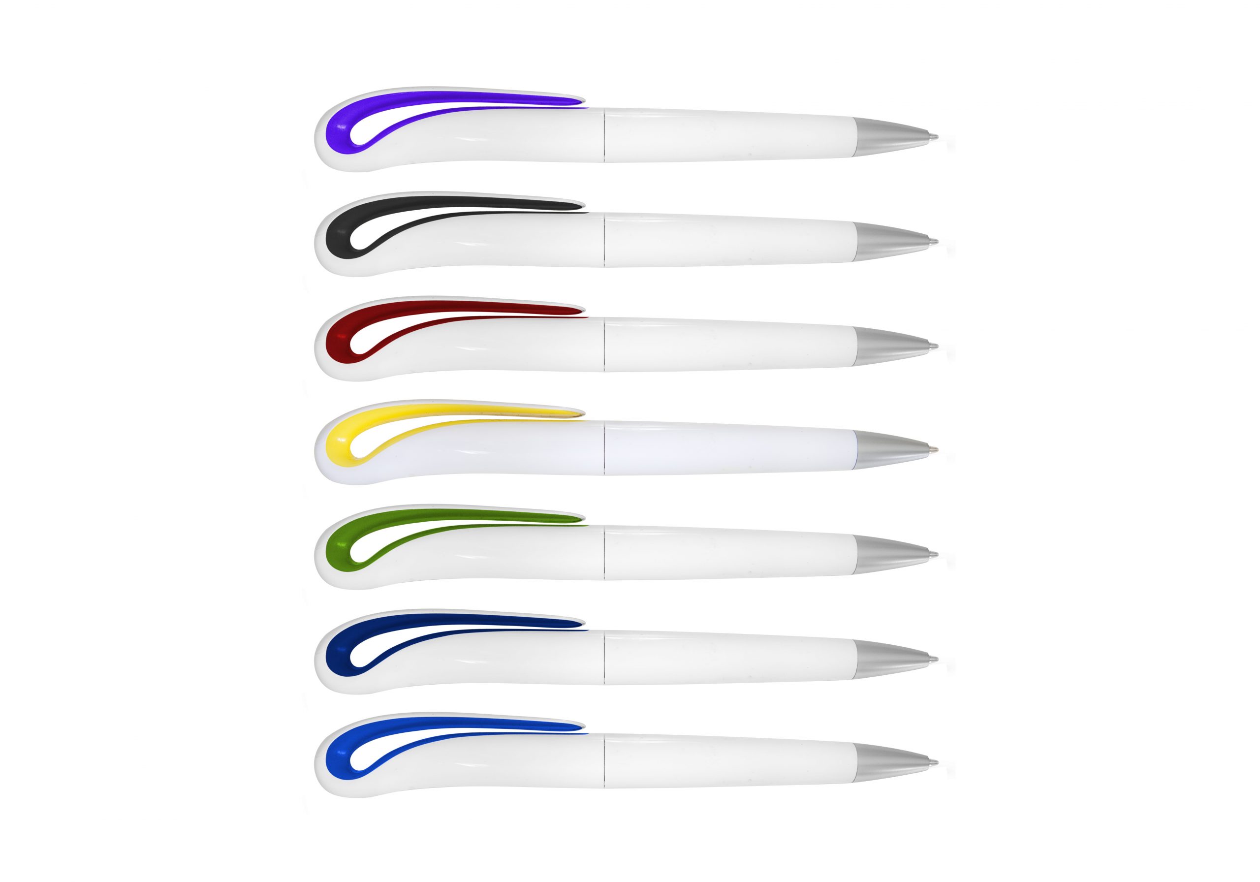 Quirky – that’s the best way to describe this promotional pen. This pen has a unique curved clip design accentuated with different colors. Its solid white barrel can be customised by pad printing or 4CP digital printing. |