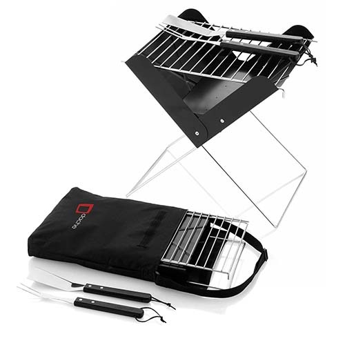 This foldable BBQ set made of sturdy steel, and the accompanying BBQ tools fit neatly into the 600D Polyester carry bag for convenience. The stainless steel fork and spatula both have black wooden handles.