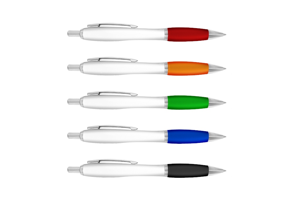 | DESCRIPTION | Plastic Pen with a solid white barrel that is accentuated with a colored rubber grip and a silver trim. |