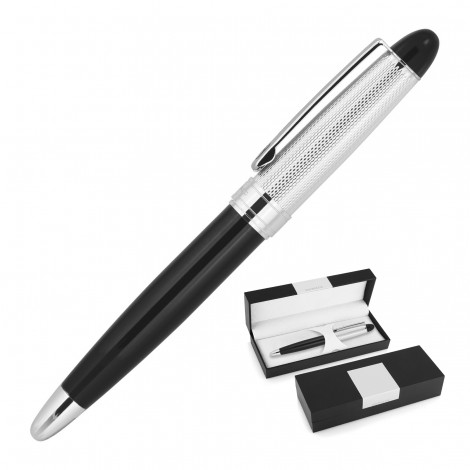 Choose the Derofe Fine Writing Instruments Sterling Rollerball Pen for your client’s personal or promotional gift. With extra smooth German rollerball, delivering black ink, an elegant black gift box, print/engrave and Schmidt ceramic refill, made in Germany – 0.07 medium nib, are included. Finished in fine black with chrome trim, this precision writing instrument can be printed or laser engraved to celebrate your logo or name on the upper barrel.